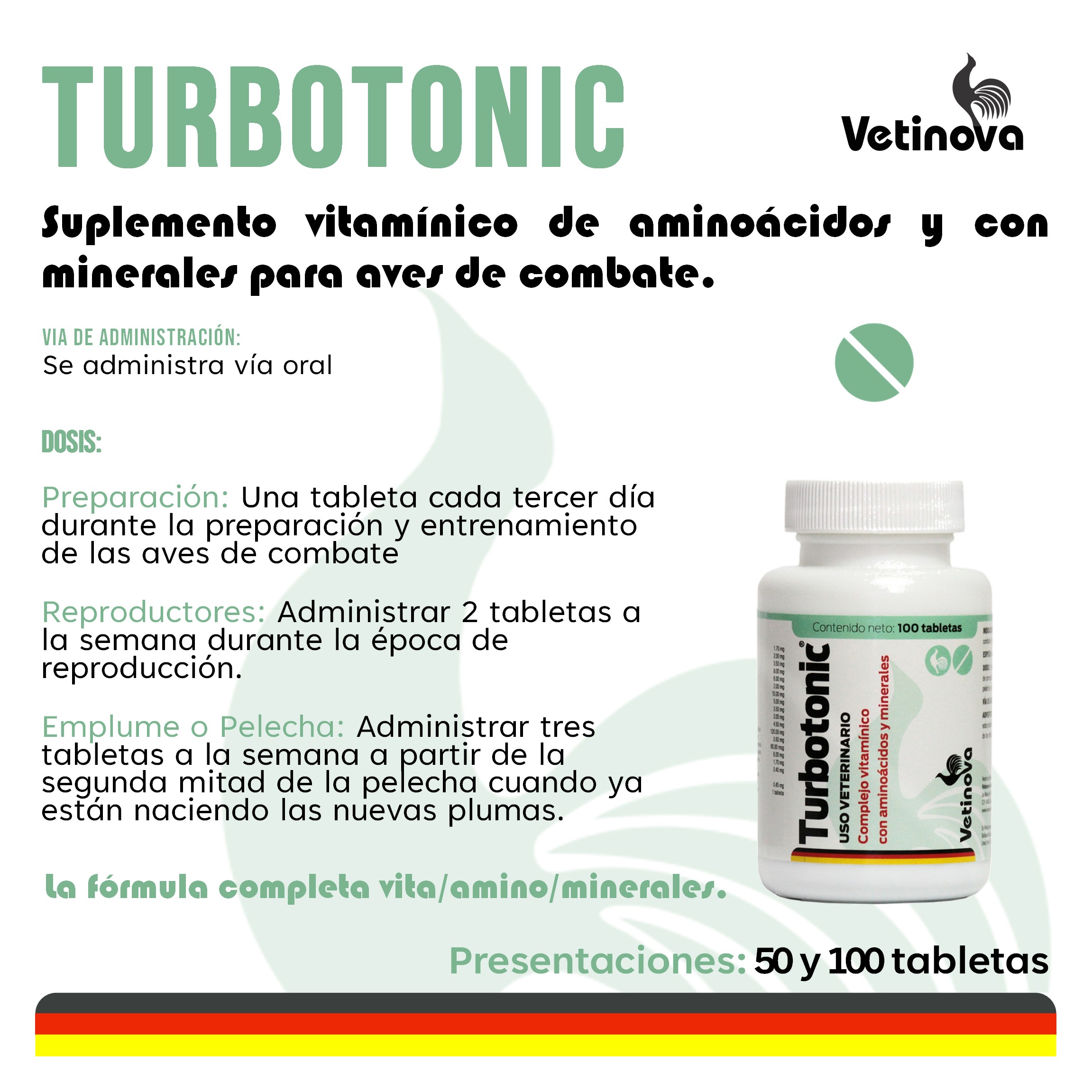 Suplemento vitamínico, con aminoácidos y minerales para aves de combate.